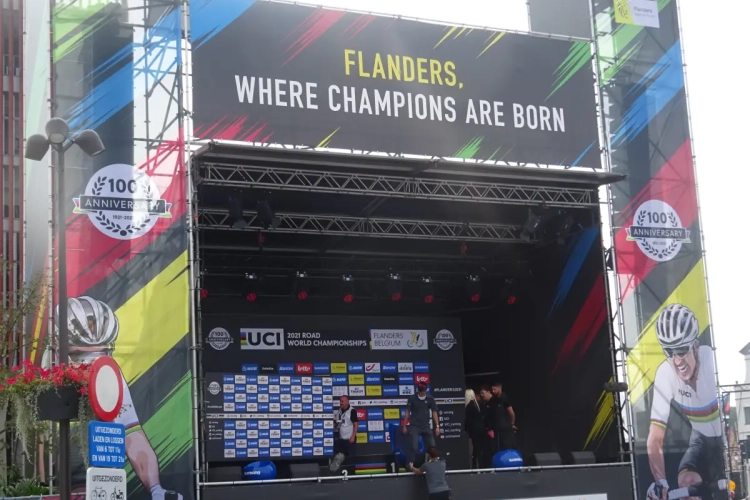 Het podium kunt u hierboven zien, dat is gevestigd aan 't Zand in Brugge. Zoals bekend zijn toeschouwers overal toegelaten en aan de aankomst is er dan ook een heus fandorp neergepoot, waar supporters naar kunnen afzakken. Daar worden uiteraard vooral Belgen verwacht die hopen op een triomf van Wout van Aert of Remco Evenepoel.