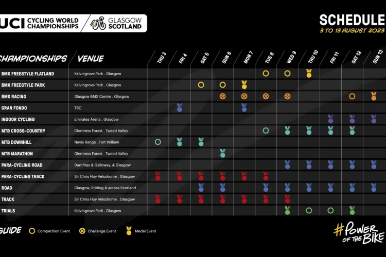 Onder meer deze details zijn af te leiden uit het schema van het WK wielrennen 2023, dat de UCI via een persbericht verspreidt heeft. Het WK gaat volgend jaar door in Glasgow en duurt maar liefst tien dagen, van 3 augustus tot en met 13 augustus.