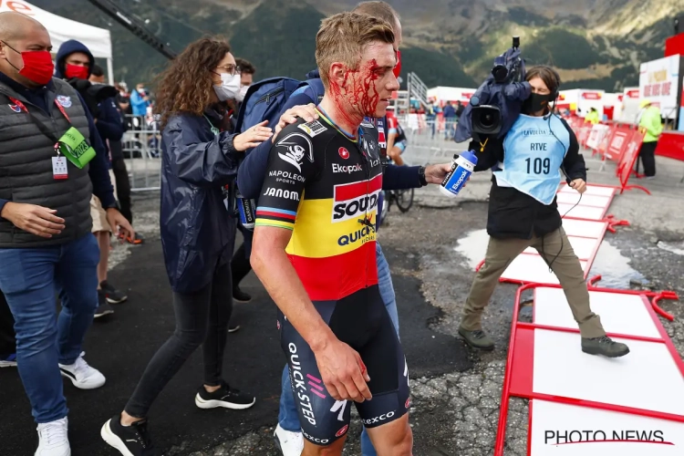 Evenepoel viel en bleef met een bebloed gezicht en een hoofdwonde achter. "Zo'n super mooie zege en dan was er jammer genoeg te weinig ruimte na de finish", zei de Belgische kampioen bij Sporza.