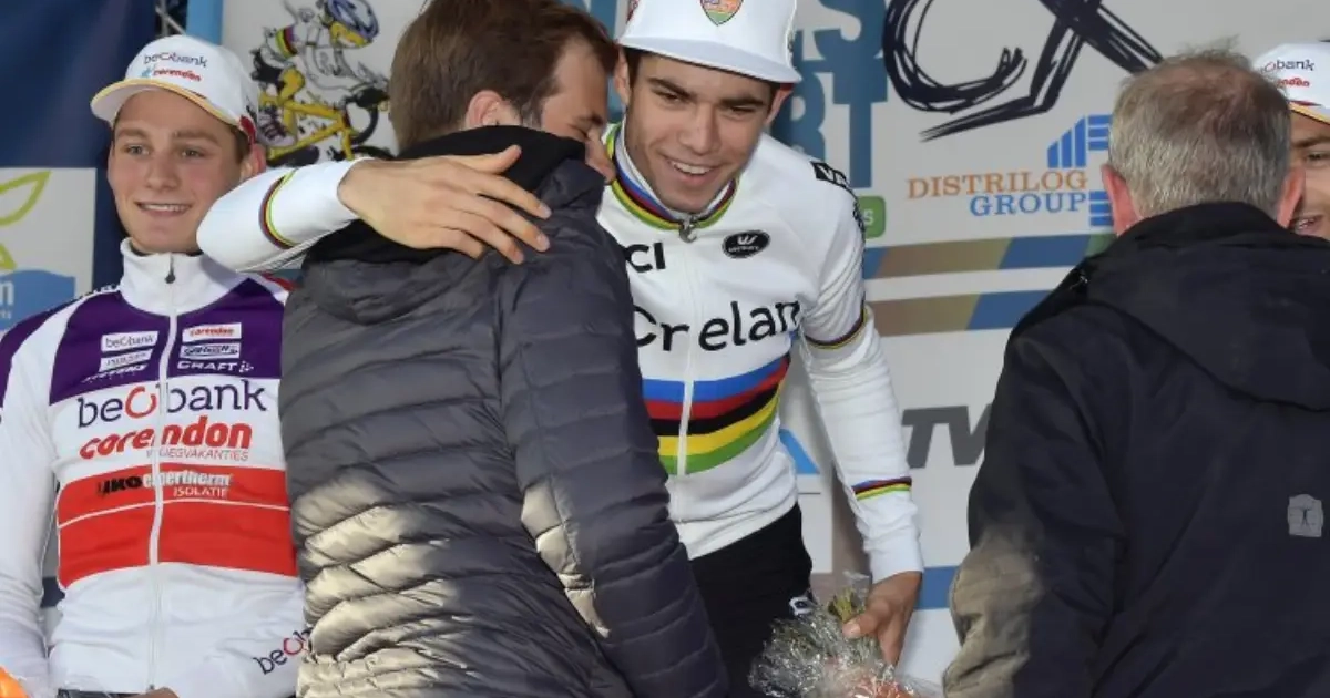 Wout van Aert profiteerde van een valpartij van Mathieu van der Poel in de Niels Albert cross in Boom. De wereldkampioen beseft dat hij door het oog van de naald was gekropen, maar heeft geen medelijden met zijn Nederlandse rivaal.