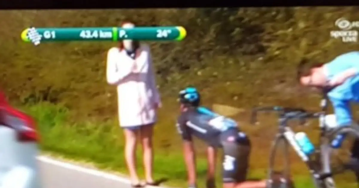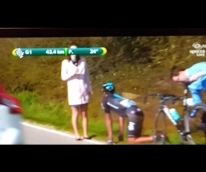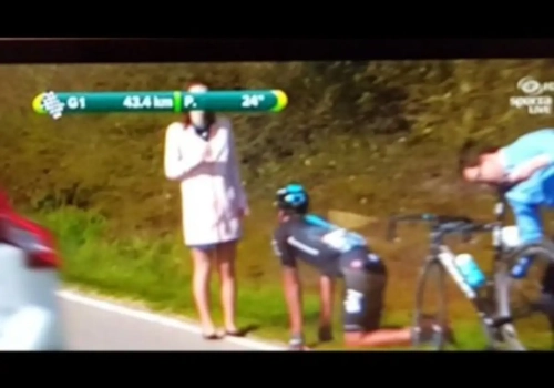 Het leek of het jonge talent van Team Sky op de knieën ging voor een toeschouwer langs de kant. Al leek die niet bijzonder onder de indruk te zijn van zijn 'knieval'. Reden genoeg voor de ploegmaats van Moscon om de draak te steken met hem.