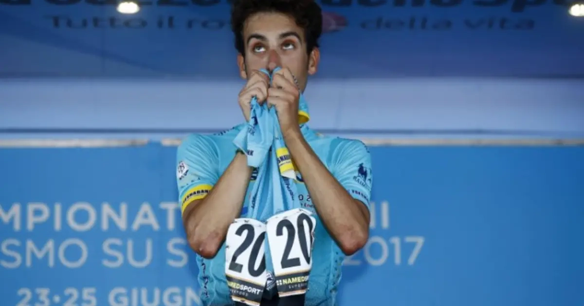 Fabio Aru is duidelijk zijn verongelukte ploegmaat Michele Scarponi nog niet vergeten. De Italiaanse renner werd nationaal kampioen in... een shirt van zijn goeie vriend.
