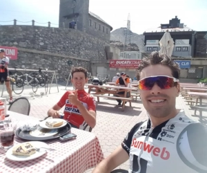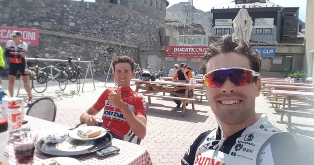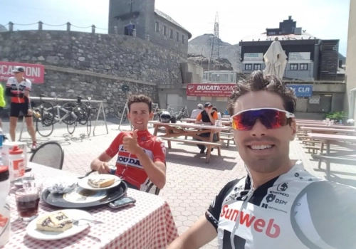 Belgisch-Nederlands onderonsje op de Stelvio vandaag. De jonge landgenoot Tiesj Benoot reed samen met Giro-winnaar Tom Dumoulin de legendarische klim in de Italiaanse Alpen omhoog.