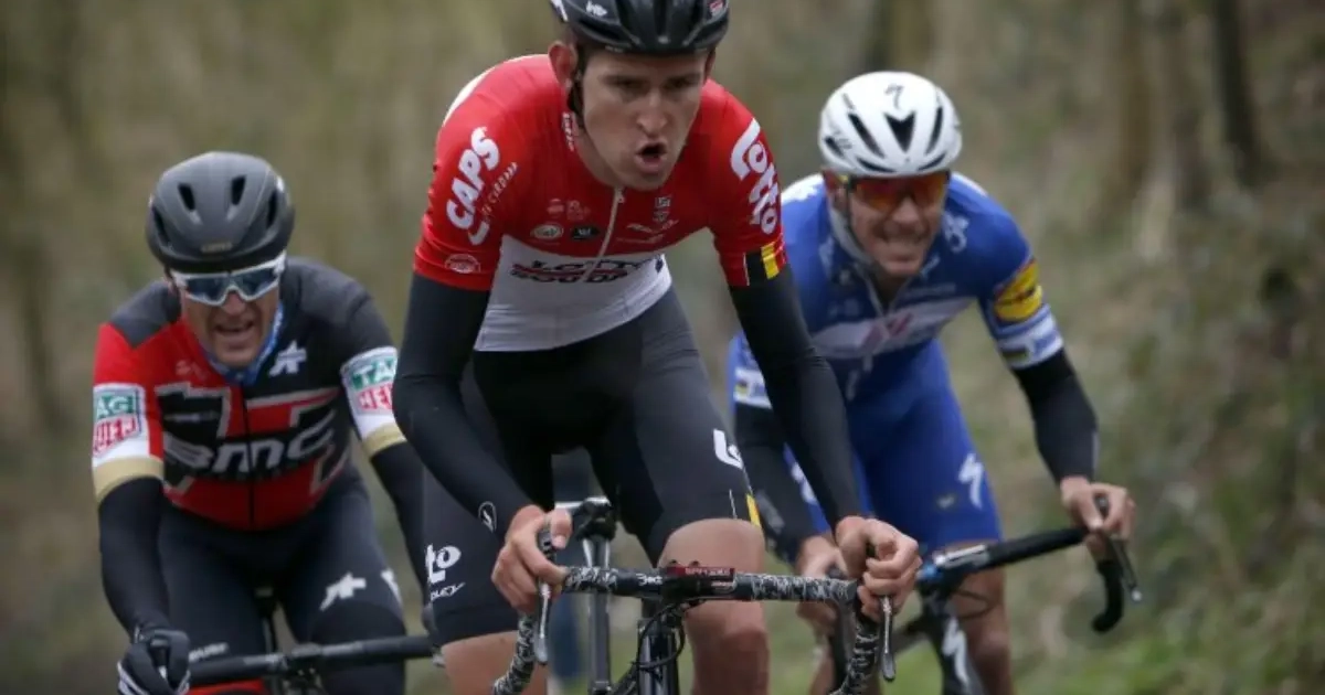 Tiesj Benoot is op het lastige parcours en in het gure weer in Dwars Door Vlaanderen één van de speerpunten, hij steekt nog steeds in bloedvorm.