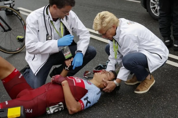De Rus liep verscheidende blessures op na een bezoek aan het ziekenhuis. "Spijtig nieuws over Vyacheslav Kuznetsov", klonkt het bij Katusha-Alpecin. "Vyacheslav zal niet meer starten in de tweede rit. De diagnose is een gebroken borstbeen, een hersenschudding en een gekneusde nier."