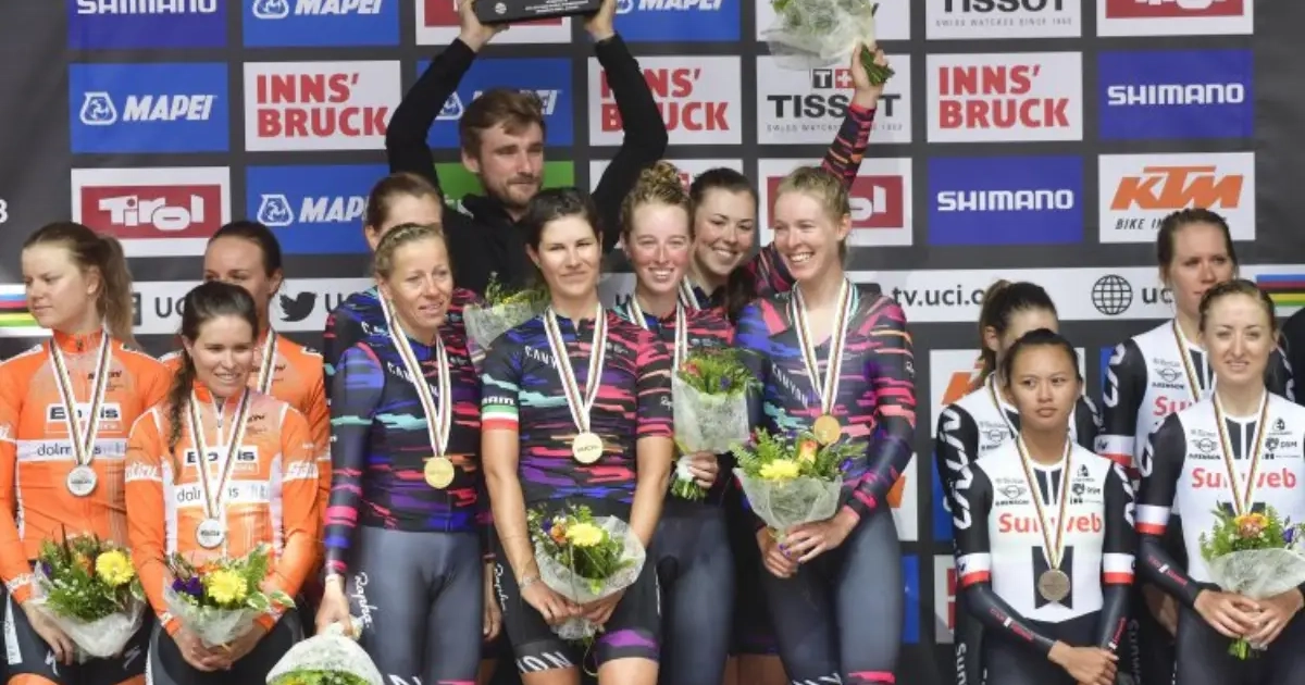 Het WK wielrennen in het Oostenrijkse Innsbruck is nu helemaal op gang getrapt met de ploegentijdrit bij de vrouwen. Het was de Duitse ploeg Canyon-SRAM Racing die goud pakte.