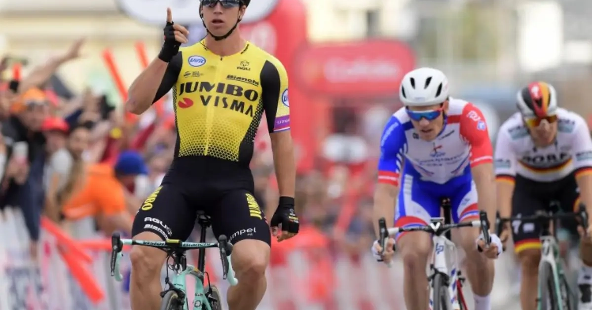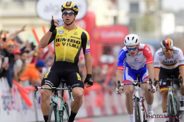 Dylan Groenewegen heeft meteen raak geschoten in de eerste etappe van de Koers naar de Zon. Of is het de koers met de smikkel in de wind?