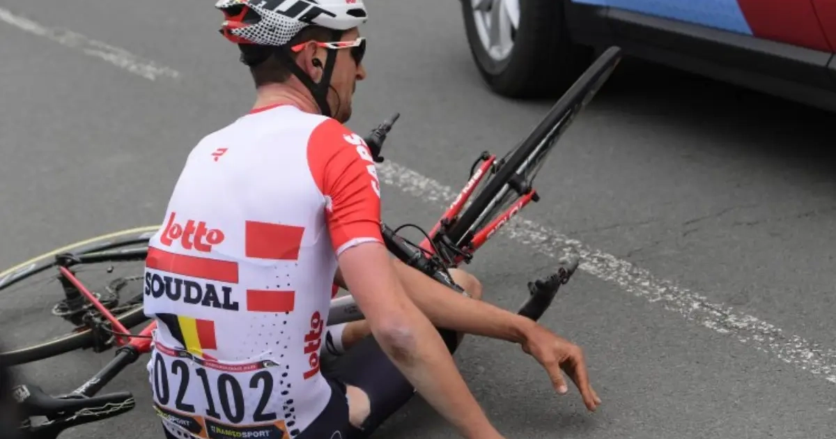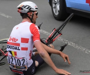 De Lotto Soudal-renner, samen met Jens Keukeleire kopman in de Hel, kon een ploegauto van Jumbo-Visma niet meer vermijden en smakte tegen de grond.