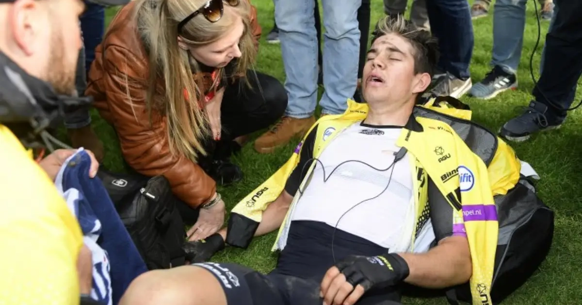 Van Aert ging languit op de grond liggen na zijn 'Hel van het Noorden'. Er kwam zelfs met moeite een woord uit in toen Sporza hem naar een reactie vroeg. Niet onlogisch, na de slopende wedstrijd van de drievoudige wereldkampioen veldrijden.