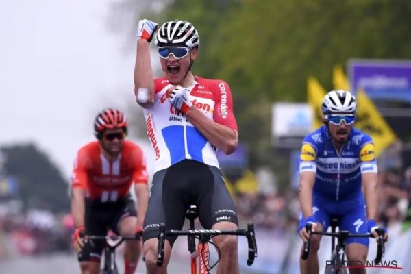De Deen versnelde enkele keren, maar Alaphilippe gaf geen krimp. De twee begonnen in de slotkilometers te veel naar elkaar te lonken en plots kwam de Pool Kwiatkowski nog aansluiten in de slotkilometer. Maar dat was nog niet alles.