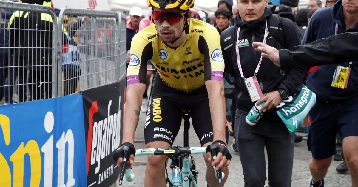 Maar Tolhoek was dus eerder dan de ploegauto bij Roglic, waardoor de Sloveen de fiets van de Nederlander nam. Daarmee kwam hij in de afdaling ook nog eens ten val, waardoor hij 40" verloor op het groepje met roze trui Richard Carapaz.