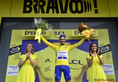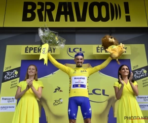 Een mooie bonus is dat Alaphilippe ook aan de leiding komt in het klassement. "Dat is ongelooflijk. Ik ben blij dat ik met deze gele trui in de geschiedenisboeken van mijn sport kom. De gele trui dragen is een droom. Op deze manier ernaar op zoek gaan, is het mooiste." Loulou zal dan ook wel stevig vieren. "En nu een grote coupe champagne!"