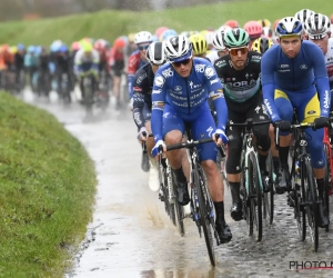 Yves Lampaert trotseert de regen, zoals vele renners dat al gedaan hebben vandaag in de Omloop Het Nieuwsblad. Lampaert zal dat er wel voor over hebben als er op het einde iets in zit. Een podiumplaats bijvoorbeeld, dat zou mooi zijn.