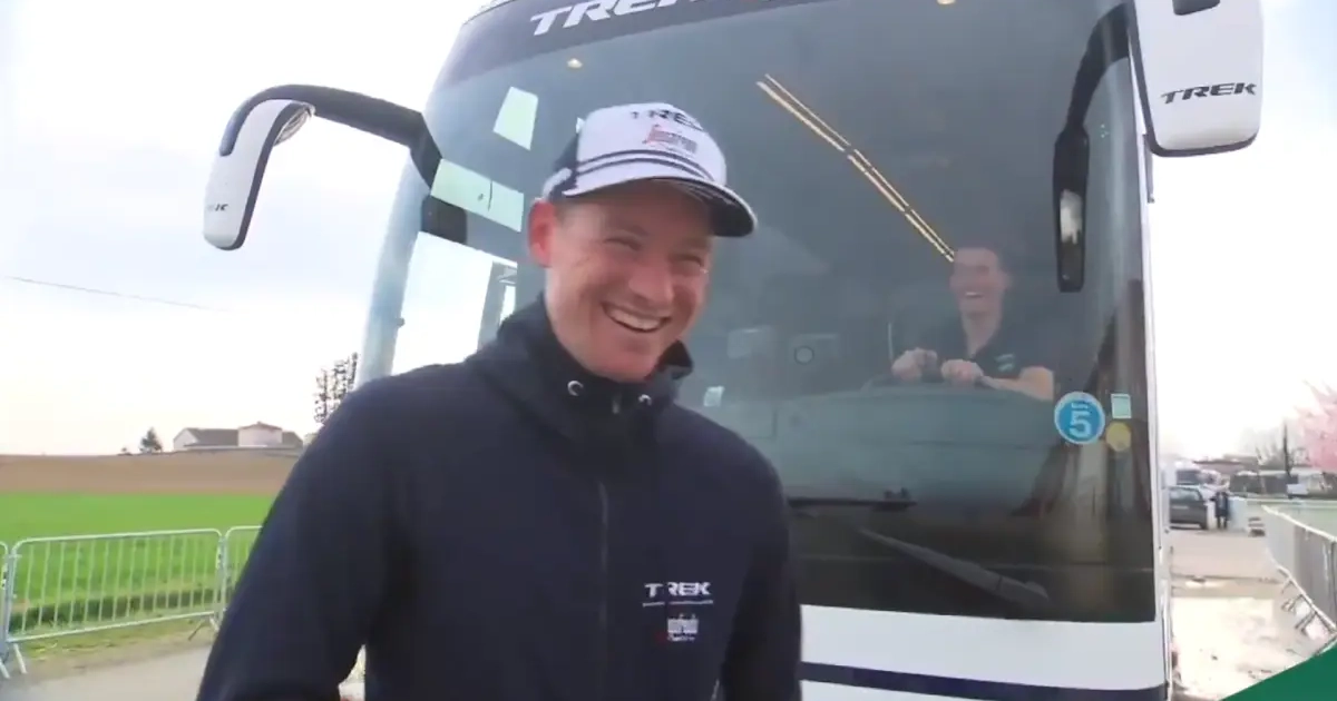 Na de rit van donderdag gaf de renner van Trek-Segafredo een interview aan ITV Cycling. Dat werd verstoord door ploegmaat en wereldkampioen Mads Pedersen⦠die de toeter van de ploegbus had gevonden.