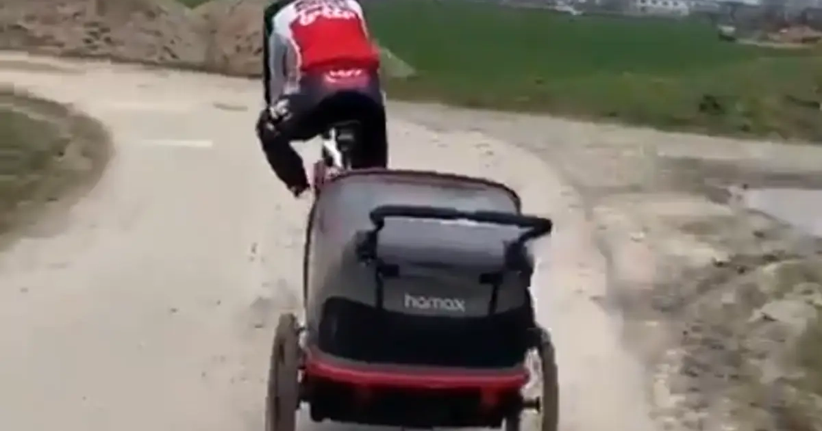 De Duitse sprinter van Lotto-Soudal hing een kinderwagen aan zijn koersfiets. Heerlijke beelden.