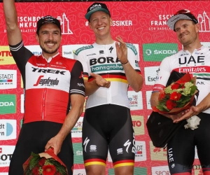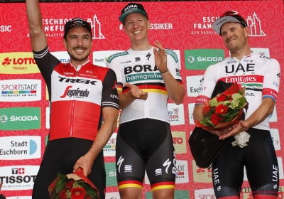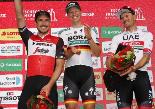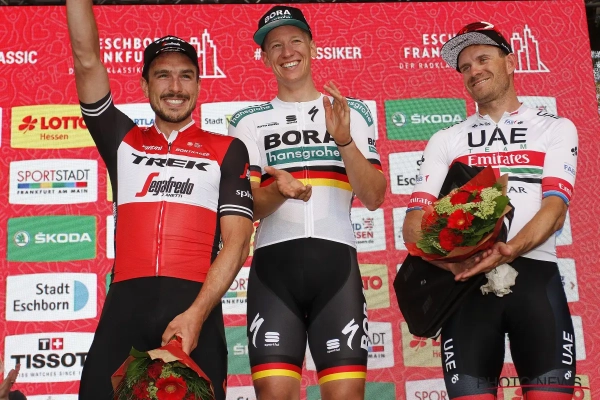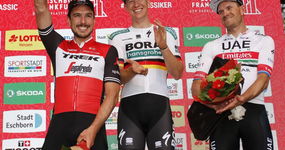 Vorig jaar nog lachende gezichten bij Pascal Ackermann, John Degenkolb en Alexander Kristoff tijdens de podiumceremonie na Eschborn-Frankfurt. Dit jaar zal de Duitse semi-klassieker niet kunnen plaatsvinden, uiteraard vanwege het coronavirus.