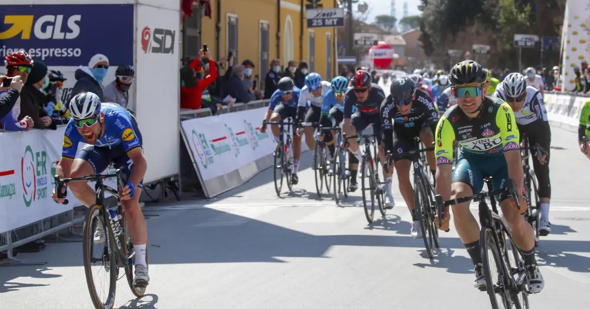 Mark Cavendish spurtte langs de rechterkant van de baan in de Coppi e Bartali, zijn Italiaanse concurrent langs de linkerkant. Het was die laatste die nog een tikkeltje sneller was. Het verschil was miniem, maar het was wel Jakub Mareczko die de zege pakte.