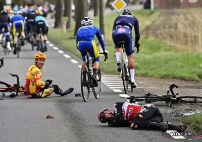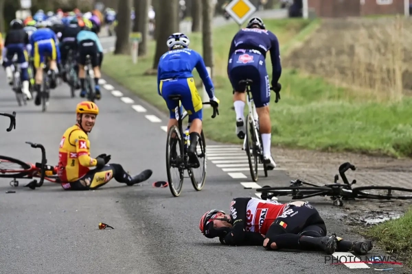 Ook Frederik Frison en Kristoffer Halvorsen waren bij een valpartij betrokken. De fietsbrillen vlogen bij momenten in het rond. Vooral Frison was hard neergekomen. Zowel zijn kousen, zijn short als zijn shirt op schouderhoogte waren gescheurd. Mogelijk heeft hij ook verwondingen opgelopen aan het gezicht. Zeker bij hem is het hopen op verlossend nieuws bij een eventuele update.