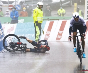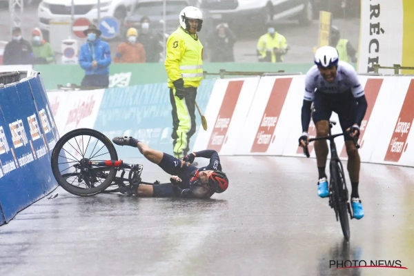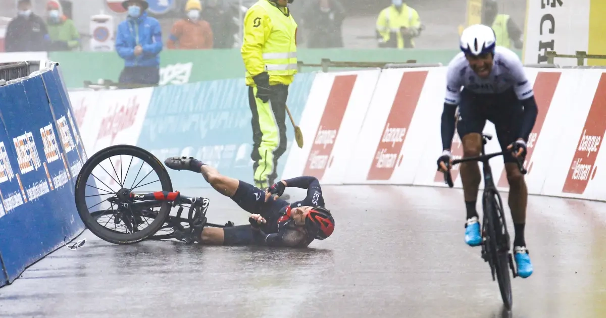 Het was een bizarre aankomst in de Ronde van Romandië. Na een loodzware bergetappe in de gietende regen, kwam Geraint Thomas in de slotmeters ten val.