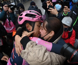 Het winnen van de Giro, zoiets wil je delen met je naasten. Dat is bij Egan Bernal niet anders. Het tafereel zagen we al in de bergrit naar Cortina d'Ampezzo: Bernal in een innig moment met zijn vriendin. Eens in de streep gekomen in Milaan was zij ook de enige waar hij oog voor had.
