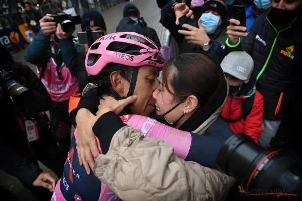 Zo hoort het natuurlijk ook, mooi om zien. Enkele minuten eerder had Bernal nog het zegegebaar gemaakt bij het over de streep rijden aan het einde van zijn Giro. Na de finish stond zijn vriendin María Fernanda Motas hem op te wachten. Ze vielen mekaar in de armen.