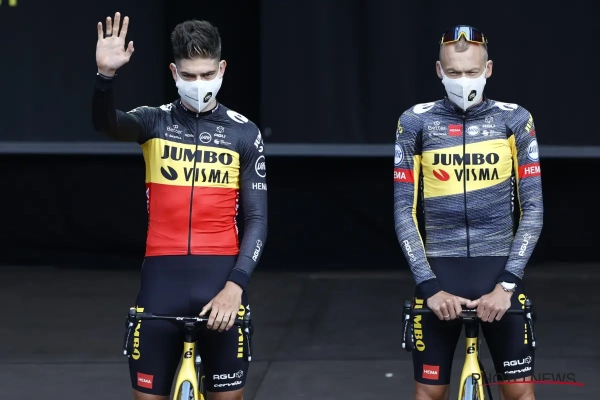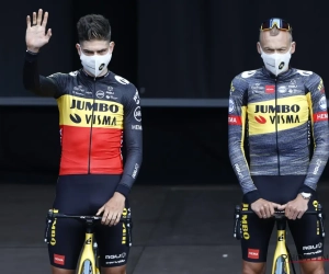 De renners van Jumbo-Visma droegen hun aangepaste 'Rapid Rebel'-shirt en Wout van Aert natuurlijk zijn trui van Belgisch kampioen. Geen kampioenentrui overigens meer voor Primož Roglič, de nummer 2 uit de Tour van vorig jaar.