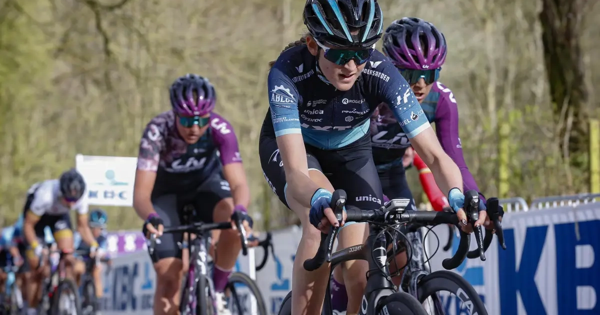 Vrijdag mocht Mischa Bredewold nog vieren nadat een drietal rensters uit de greep van het peloton bleef, ditmaal mocht Carlotte Kooi victorie kraaien in de straten van Knokke-Heist.