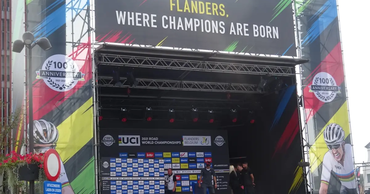 Het podium kunt u hierboven zien, dat is gevestigd aan 't Zand in Brugge. Zoals bekend zijn toeschouwers overal toegelaten en aan de aankomst is er dan ook een heus fandorp neergepoot, waar supporters naar kunnen afzakken. Daar worden uiteraard vooral Belgen verwacht die hopen op een triomf van Wout van Aert of Remco Evenepoel.