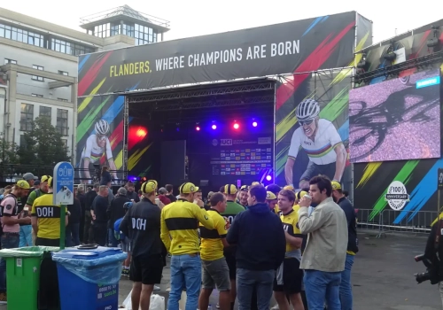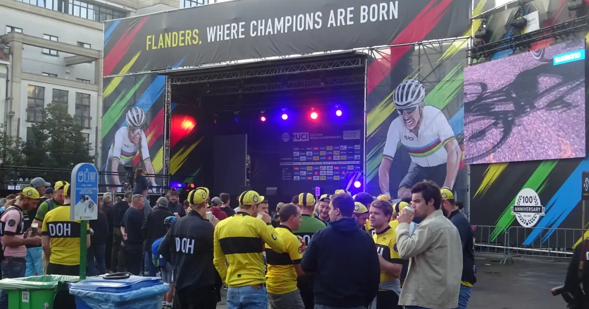 Ook in aankomstplaats Leuven uiteraard een massa volk. Onder andere aan de fanzone aan het Ladeuzeplein. Aan de overkant is er de expo zone, waar ook de WK-bus van het wielermuseum Koers bezocht kan worden. En simpelweg in het geheel langs de kant van het parcours. Wanneer de Belgen in de koers de kop nemen, gaan de decibels uiteraard omhoog.