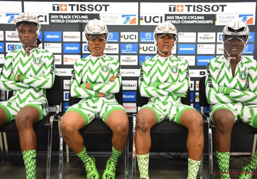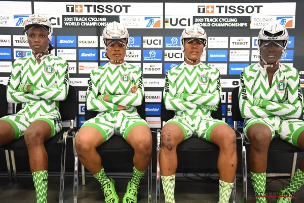 Het was ook niet enkel voor de show, want even later waagden de rensters zich wel degelijk in deze tenue op de wielerbaan. Tawakalt Yekeen, Grace Ayuba, Mary Samuel en Ese Ukpeseraye hebben sowieso al een indruk nagelaten op het WK.