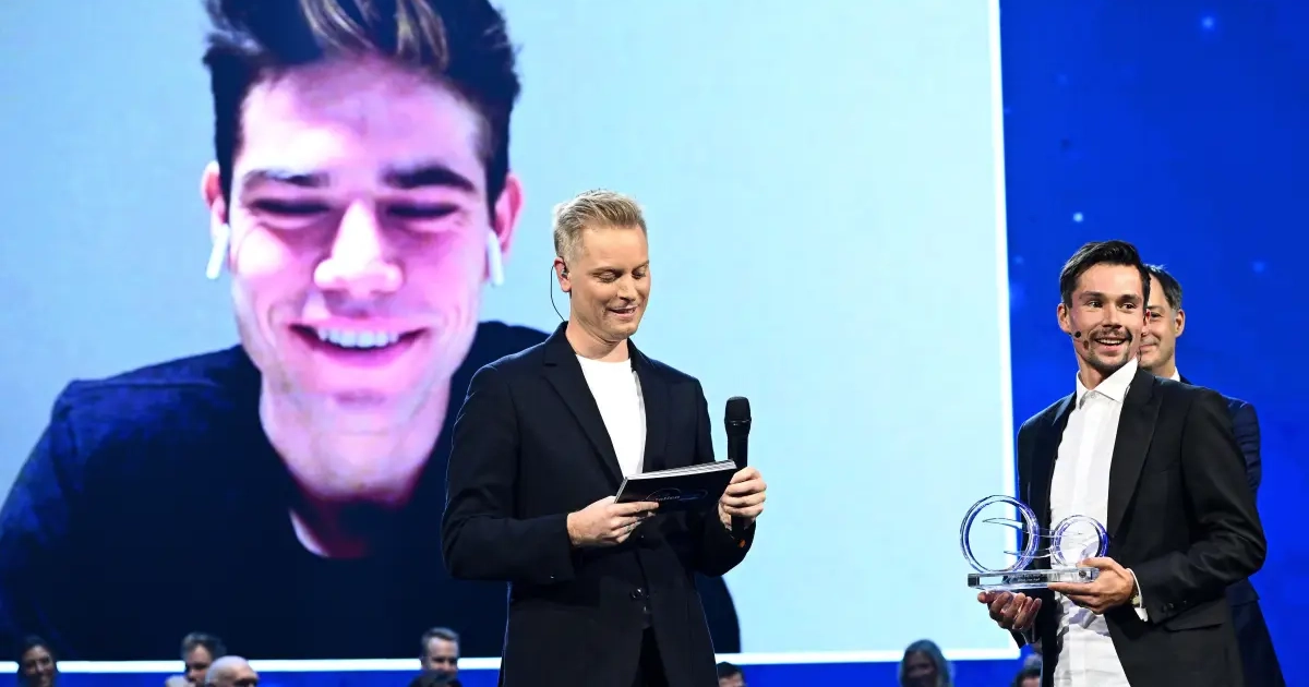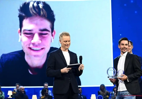 Daar stond Primož Roglič dan, klaar om de Kristallen Fiets aan Wout van Aert te overhandigen. Alleen: laatstgenoemde was ziek en verscheen enkel via videocall. Dan kom je voor hem al eens af vanuit Slovenië. "Ik neem de trofee mee naar huis", grapte Roglič.