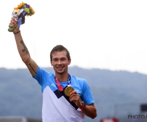 Aan Roglič dus om de doos uit te pakken en te ontdekken wat er in zat: een prachtig gouden en gepersonaliseerd tijdritstuur. Uiteraard een verwijzing naar de gouden medaille die Roglič in de olympische tijdrit in Tokio dit jaar wist te veroveren.