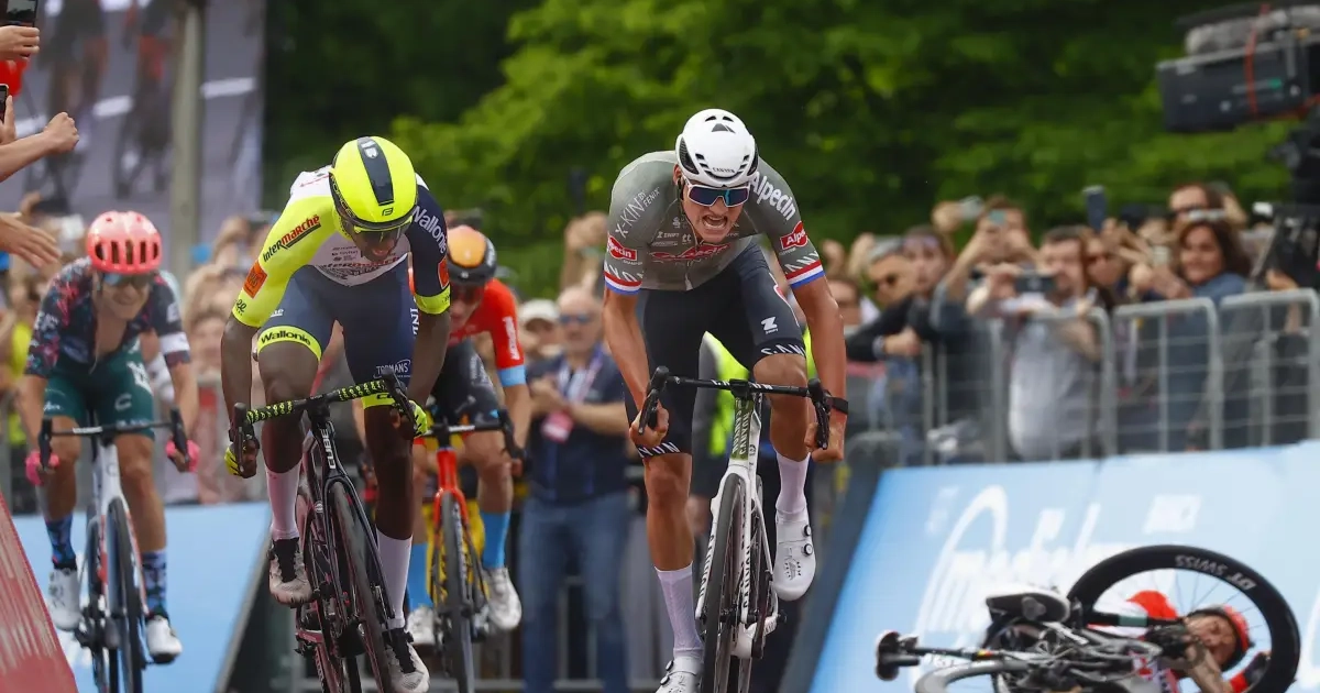 🎥 Van der Poel wint epische sprint en pakt roos, Ewan zwaar ten val