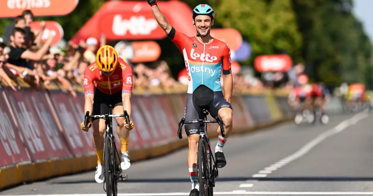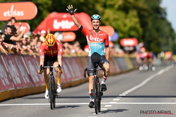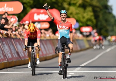 Lotto Dstny heeft zijn favorietenrol in de Druivenkoers helemaal waargemaakt. Victor Campenaerts maakte het zegegebaar, Jasper De Buyst werd derde.