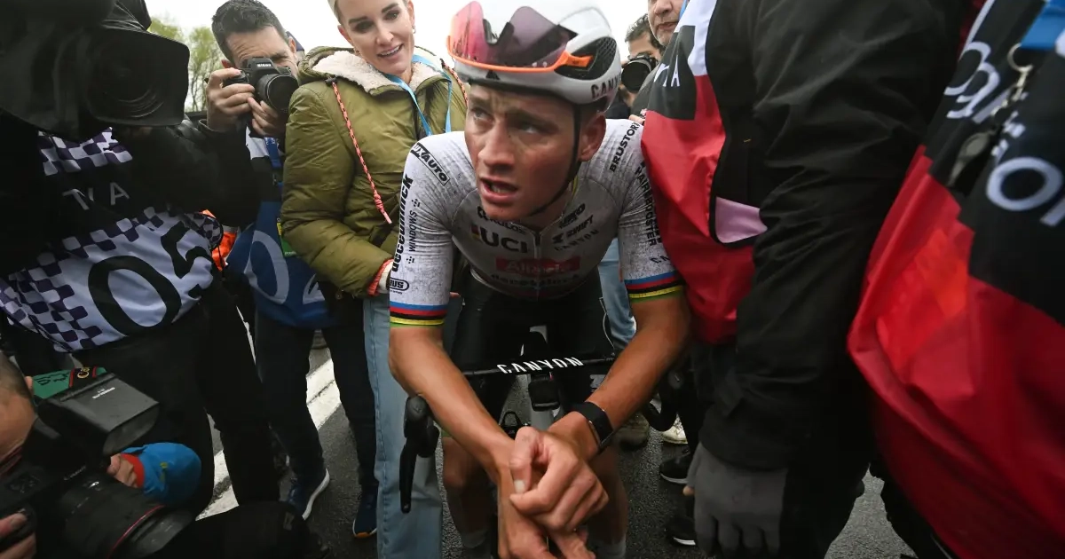Wanneer Van der Poel zei dat hij helemaal leeg was, was daar geen woord van gelogen. Helemaal vooruit gebogen zat de wereldkampioen wielrennen over zijn fiets. Met Roxanne die hem op dat moment een ondersteunende arm kon bieden.