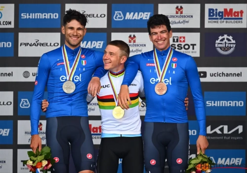 Nadat hij opnieuw de wereldtitel tijdrijden veroverde, kon er niet anders dan gesproken worden over de komische podiumfoto van Evenepoel als klein ventje tussen de Italianen.