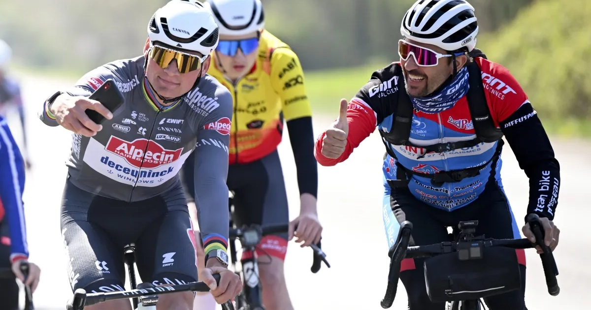 Dat was onlangs ook bij Van Aert het geval. Tijdens zijn verkenning van de Ronde van Vlaanderen kwam een fan langs hem rijden met de vraag of hij een foto wou maken. De fan in kwestie stak de duim omhoog op het moment dat de foto genomen werd. Vandaag werd exact dezelfde pose herhaald, maar dan tussen Van der Poel en zijn fan.