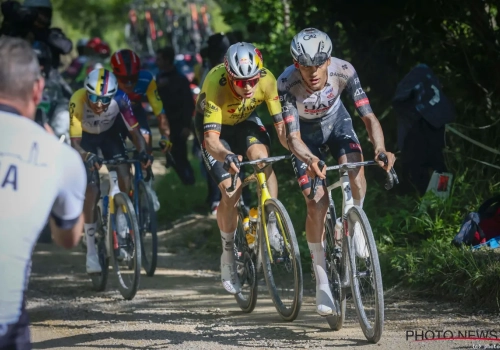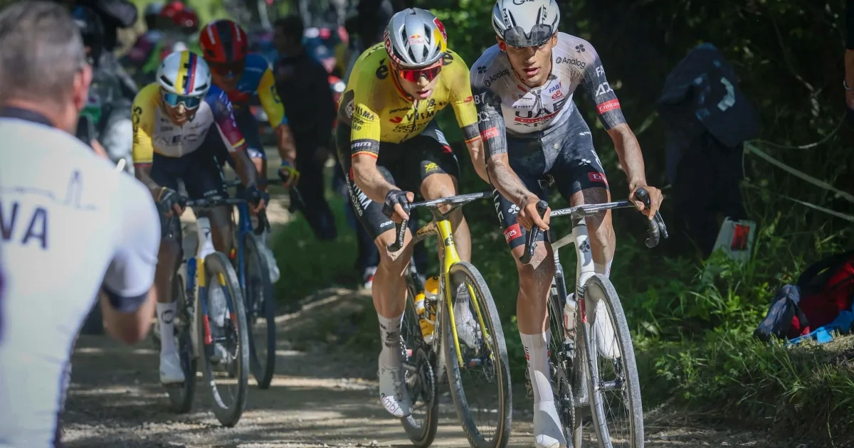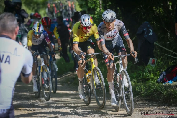 Roglic en Pidcock volgden ondertussen op zo'n twee minuten van Van Aert en co, daartussen reed de groep met onder meer Ayuso, Tiberi, Carapaz en de broers Yates op iets meer dan een minuut. Vooraan spatte de kopgroep uiteen.