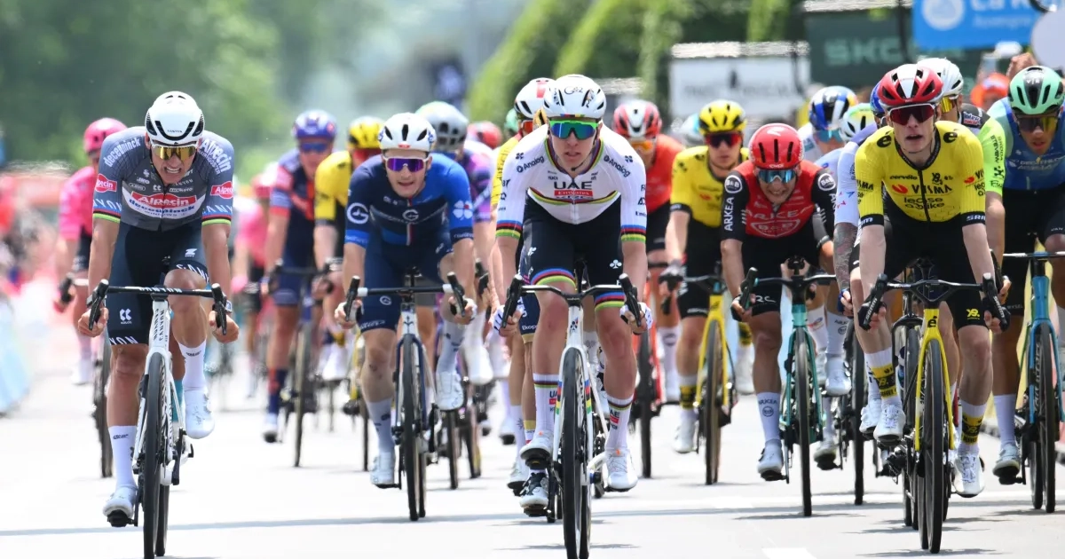 In de laatste vijf kilometer van de eerste etappe van het Criterium du Dauphiné Libéré kregen we zowaar een leidersgroepje van vijf, met daarbij Mathieu van der Poel, Jonas Vingegaard, Remco Evenepoel en Tadej Pogacar.