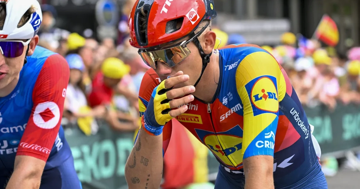 Thibau Nys moet meteen wonden likken na zijn eerste etappe ooit in de Tour de France. Hij kwam ten val en reed als derde laatste over de streep in Rijsel.