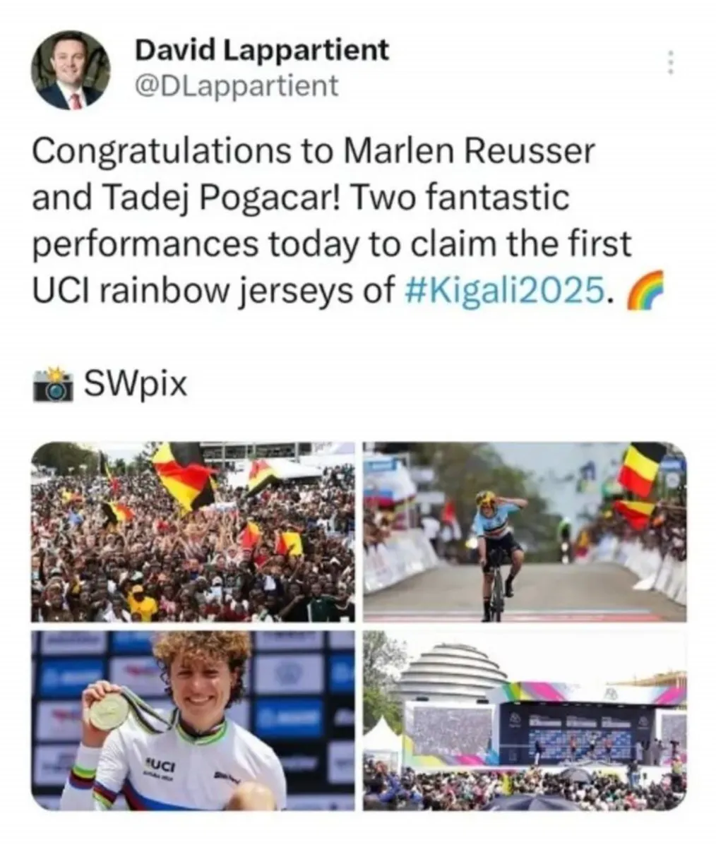 "Proficiat Marlen Reusser en Tadej Pogacar! Twee fantastische prestaties vandaag om de eerste twee regenboogtruien te claimen in Kigali." Dat schreef UCI-voorzitter David Lappartient zondagavond op Facebook.