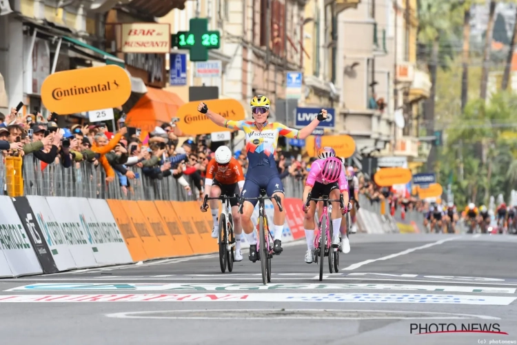 Prijs voor Lotte Kopecky in Milaan-Sanremo! Op de Poggio schoof ze mee met een aanval van Pieterse en won ze de sprint van een groepje van vijf.