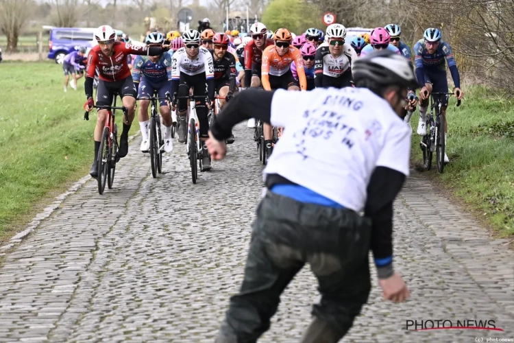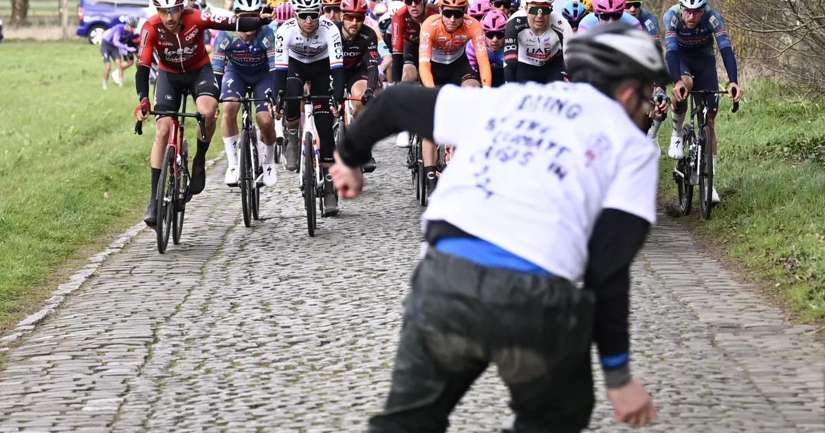 Op een kasseistrook wilde klimaatactivist Wouter Mouton zich vastkleven in de Ronde van Brugge. Mouton sprong nog opzij net voor de renners, maar zijn aanwezigheid zorgde ervoor dat er enkele renners ten val kwamen.