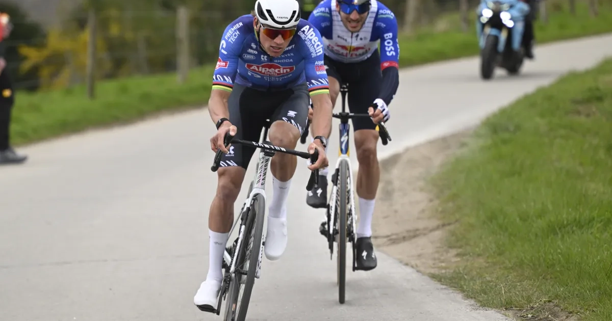Er is vanuit het peloton verbazing geuit vanwege een beslissing van Mathieu van der Poel. Die ging er op de Boigneberg alweer alleen vandoor. Dat had Tim van Dijke, die pas op de Taaienberg had aangevallen, niet verwacht.