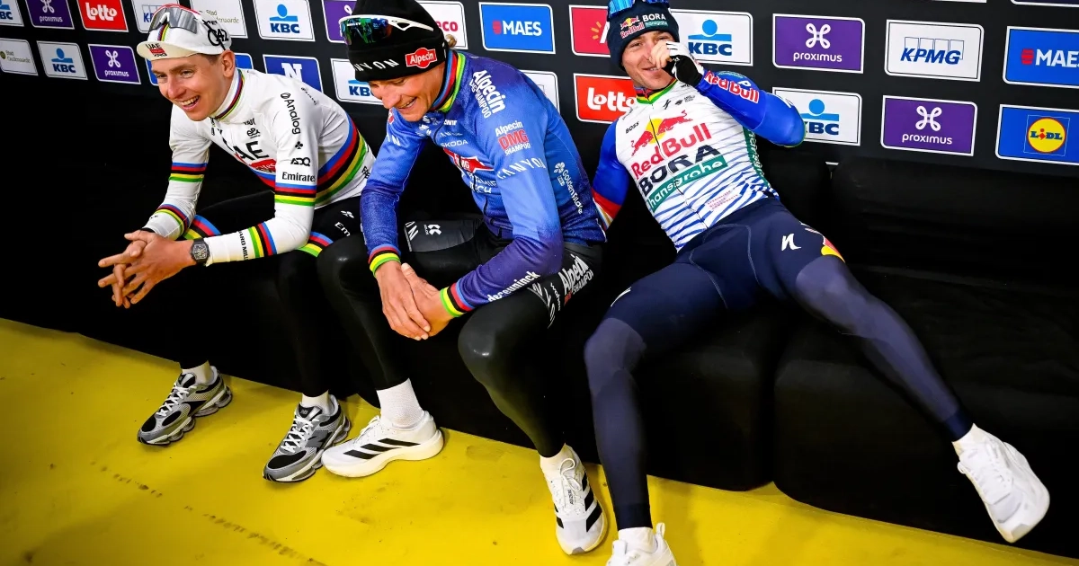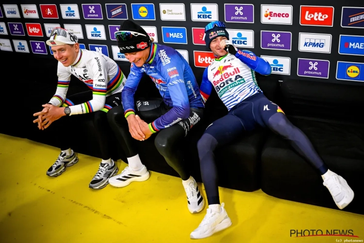 🎥 Héérlijk gewoon: Van der Poel en Pogacar plat van het lachen dankzij Evenepoel
